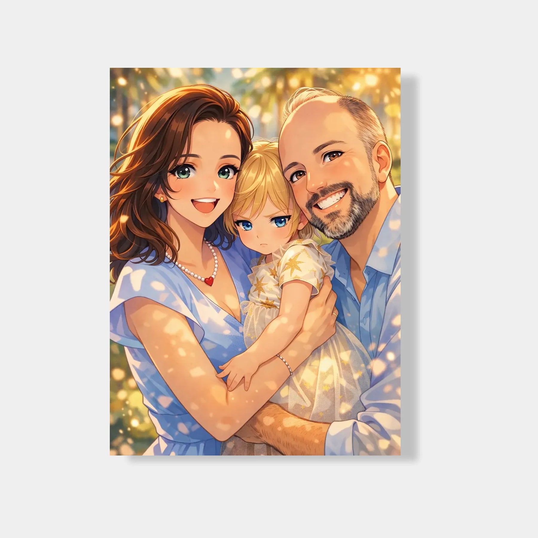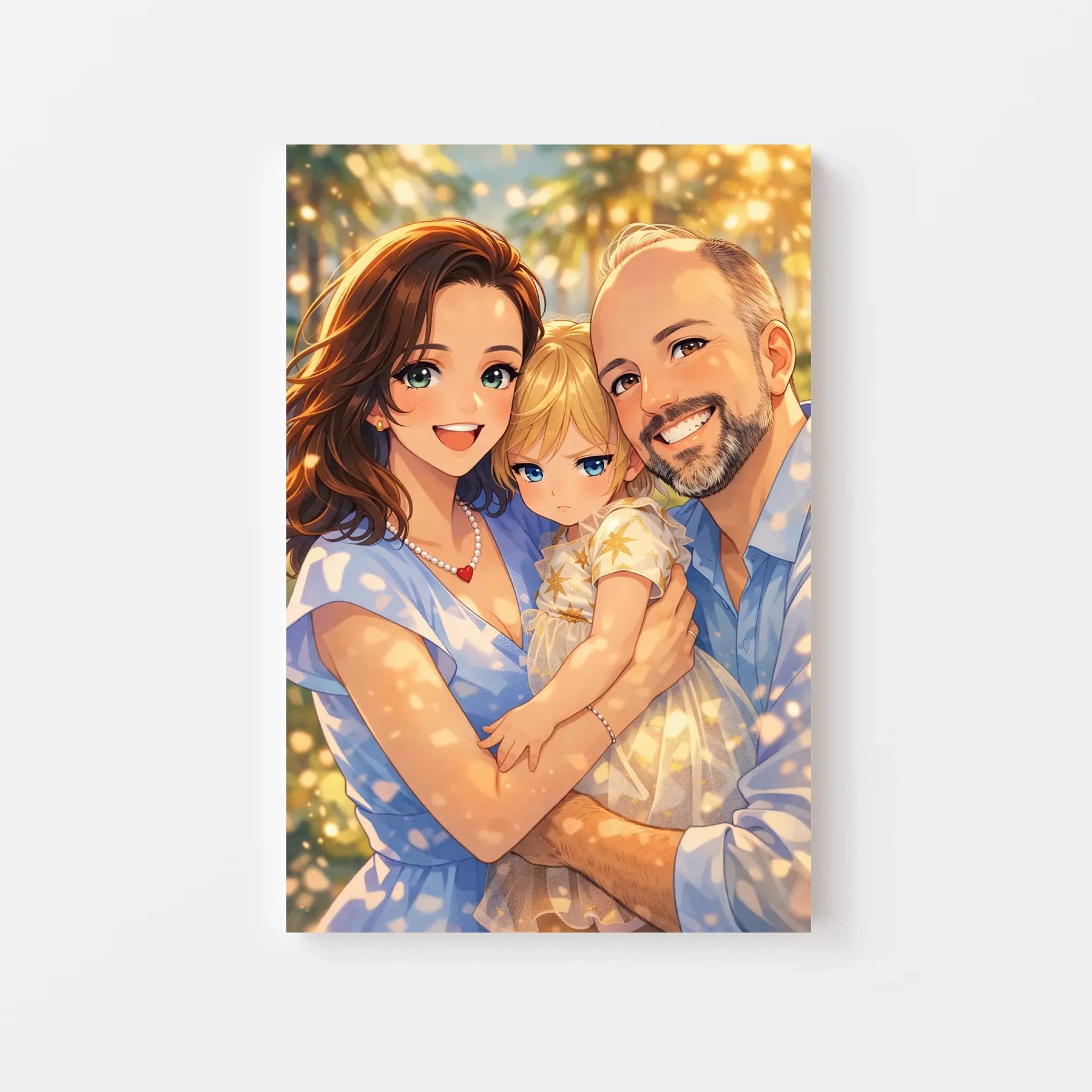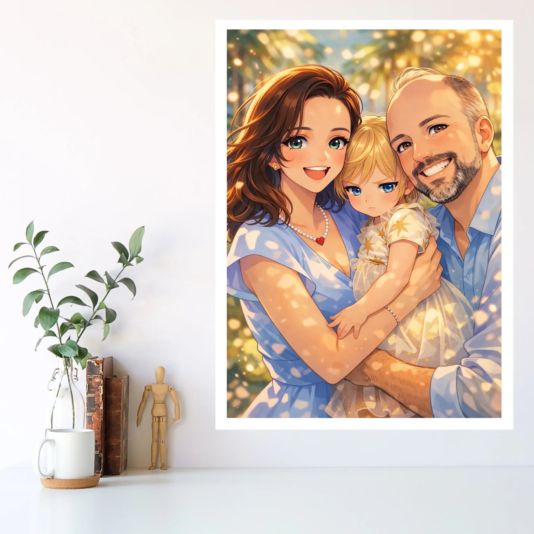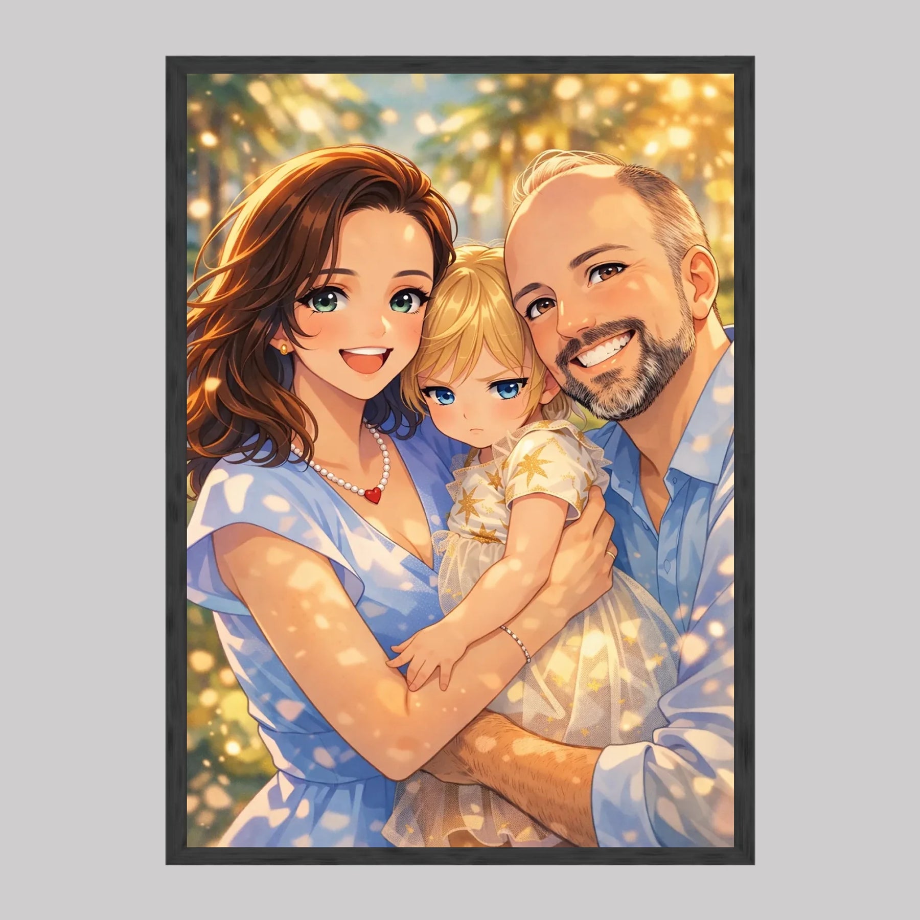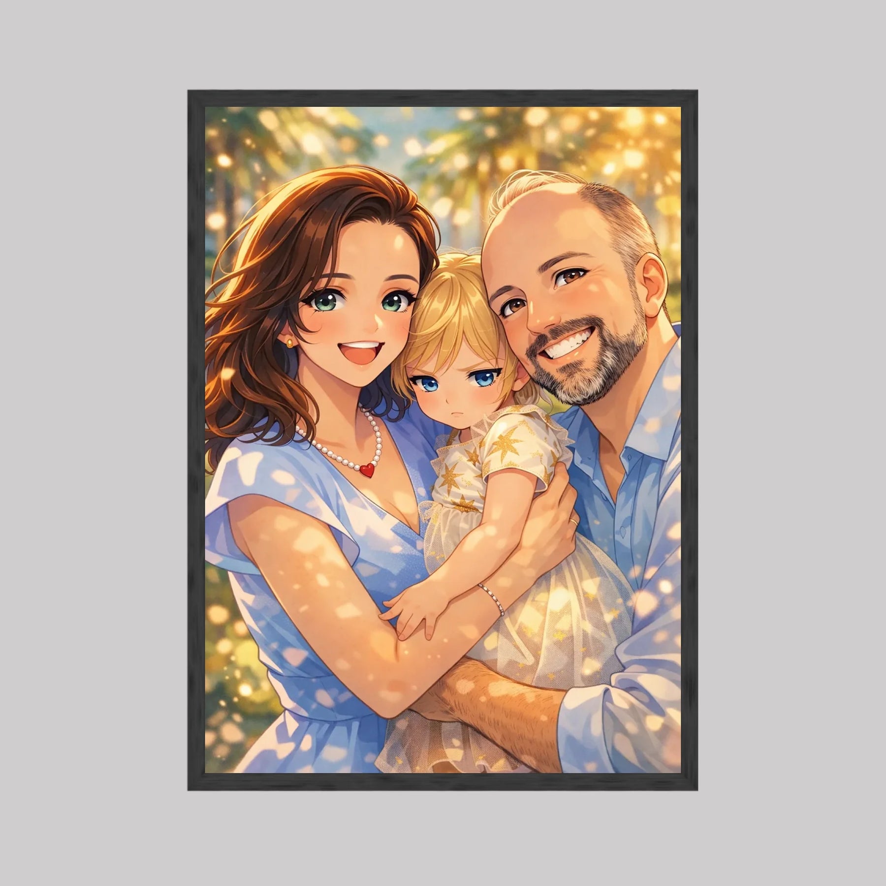 Anime stil z zlato svetlobo ustvari občutek nežnosti, varnosti in doma. Portret ne deluje kot risanka, temveč kot čustvena interpretacija družinskega trenutka, ki ga želiš imeti vedno pred očmi.