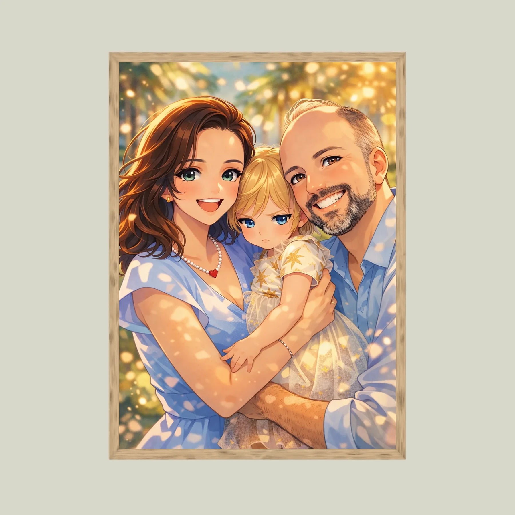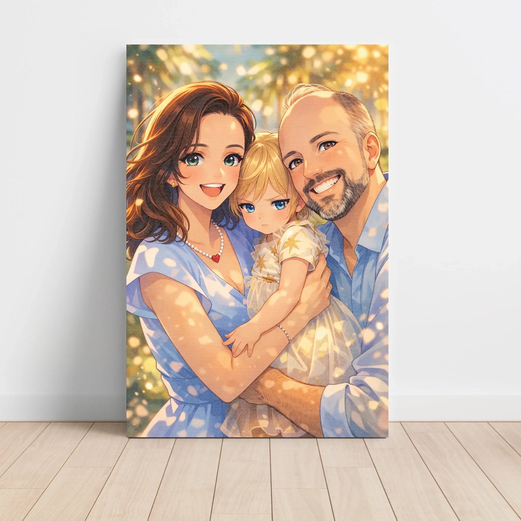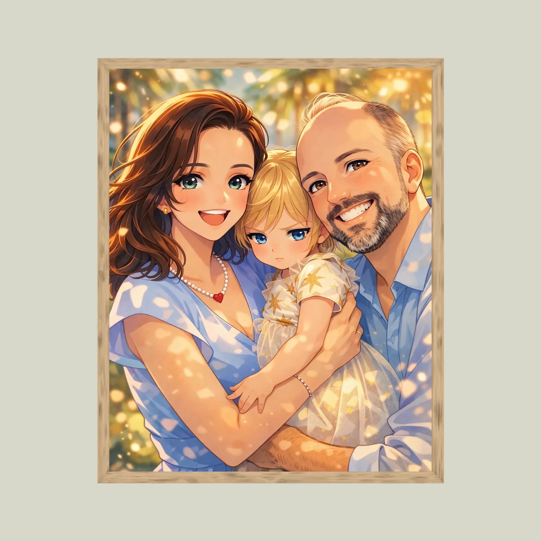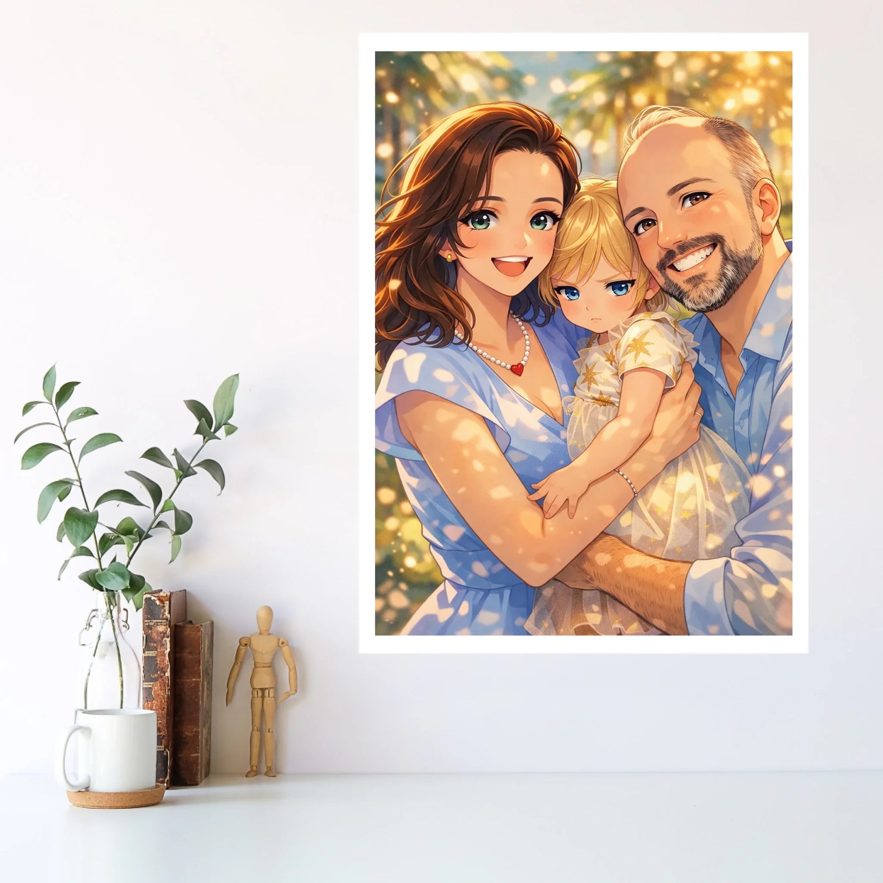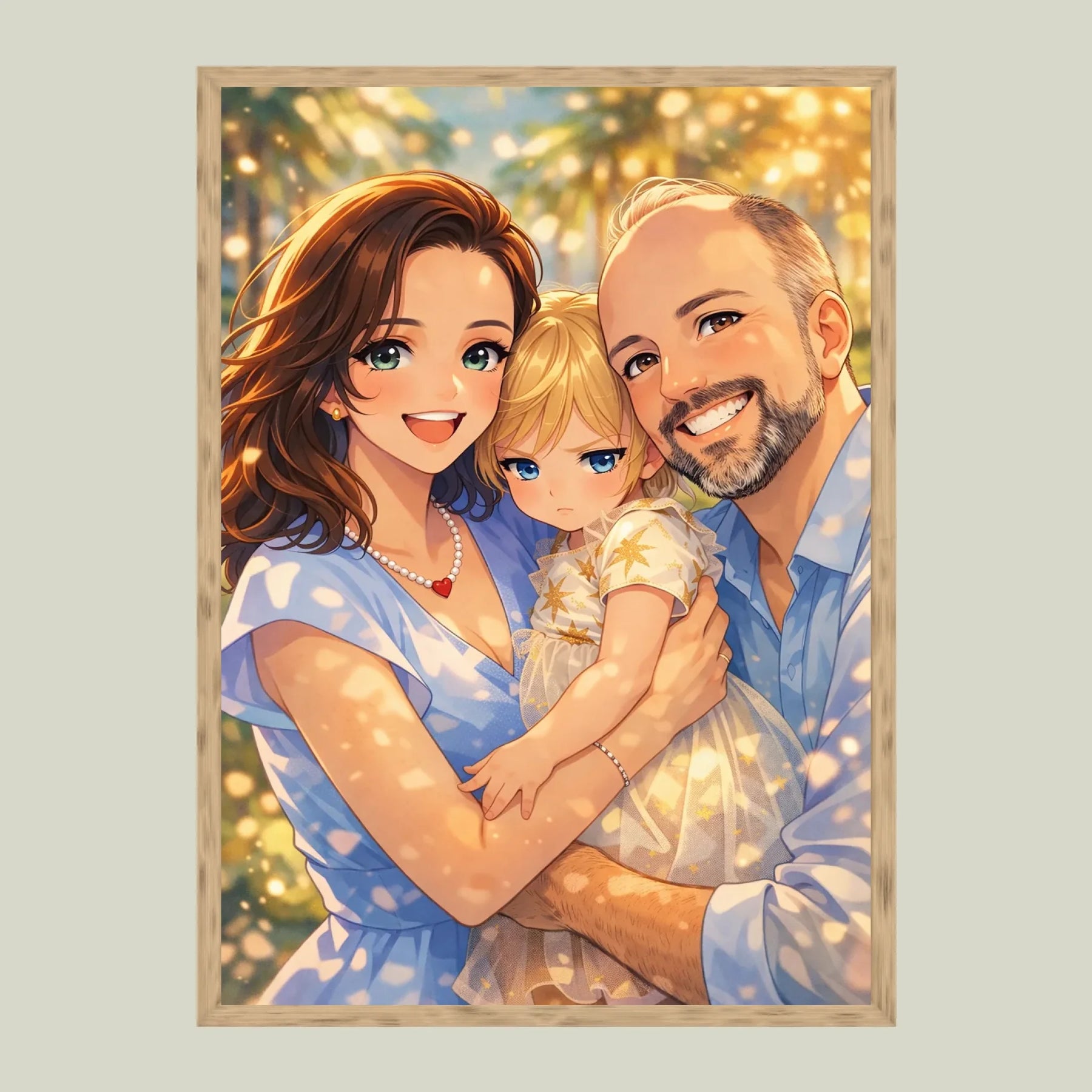 Anime stil z zlato svetlobo ustvari občutek nežnosti, varnosti in doma. Portret ne deluje kot risanka, temveč kot čustvena interpretacija družinskega trenutka, ki ga želiš imeti vedno pred očmi.