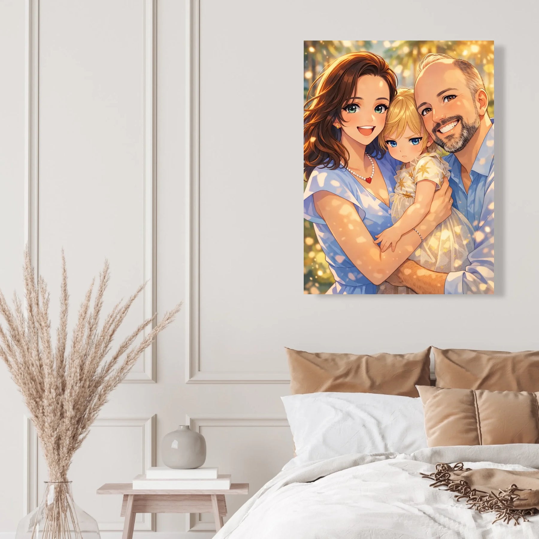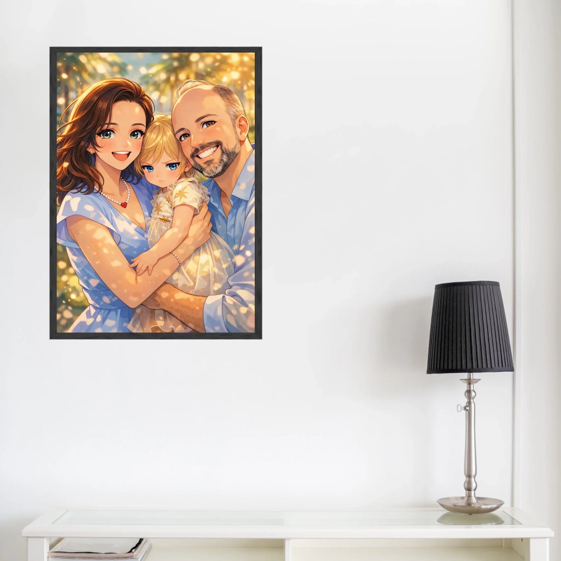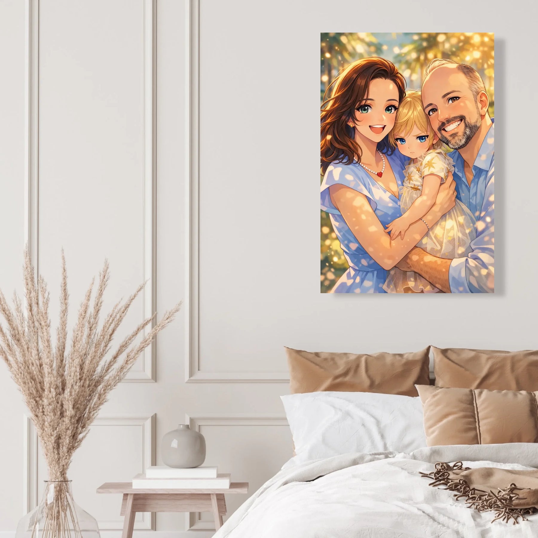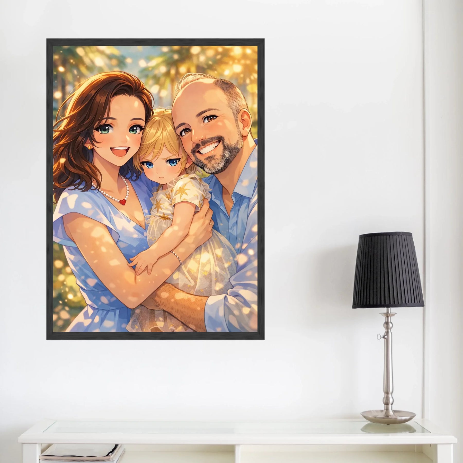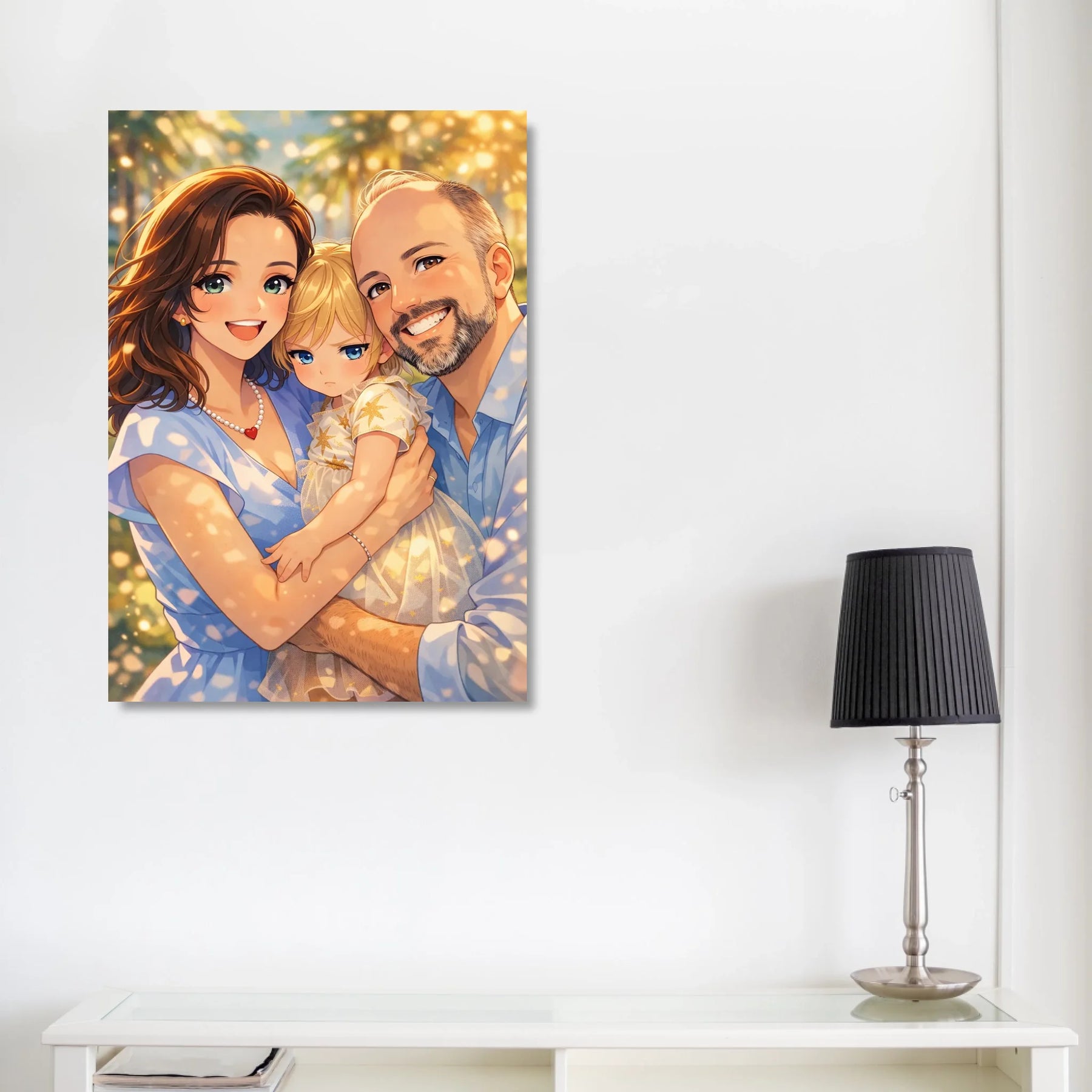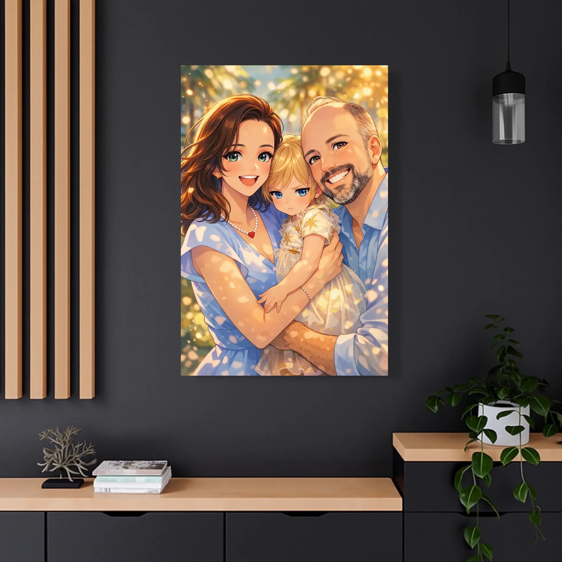 Anime stil z zlato svetlobo ustvari občutek nežnosti, varnosti in doma. Portret ne deluje kot risanka, temveč kot čustvena interpretacija družinskega trenutka, ki ga želiš imeti vedno pred očmi.