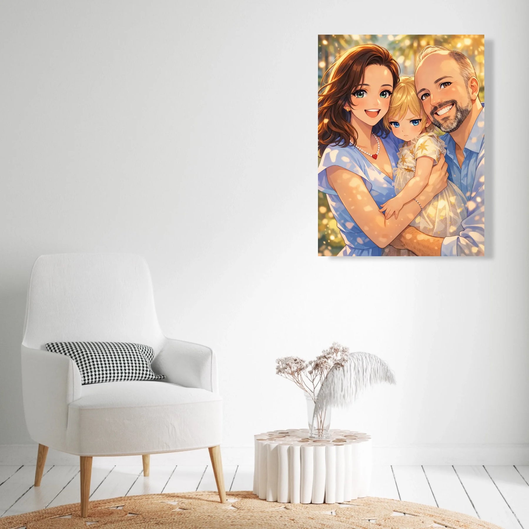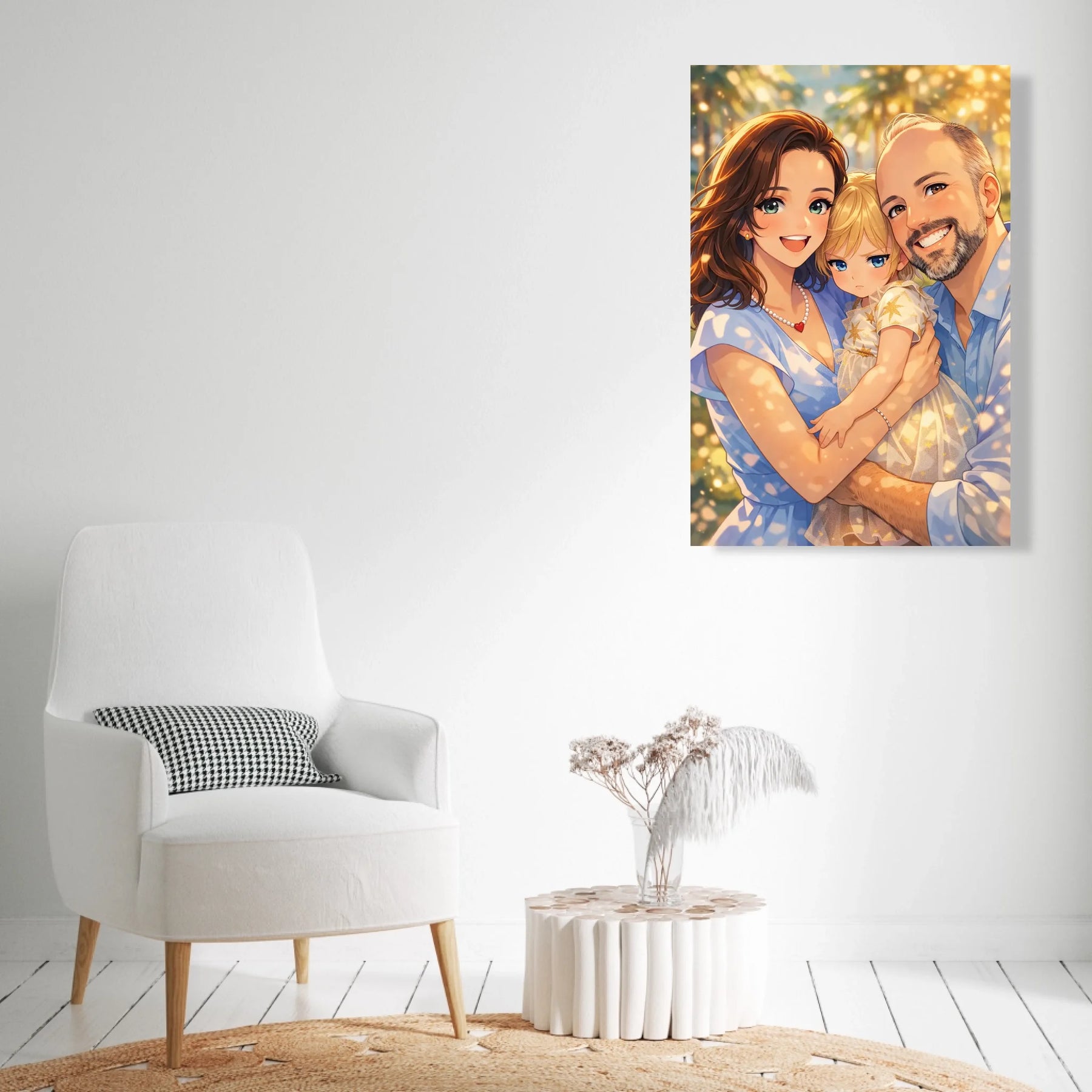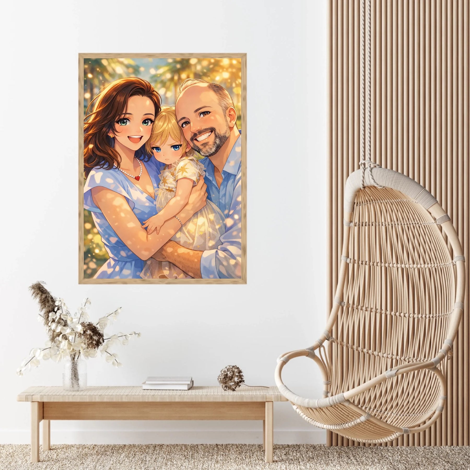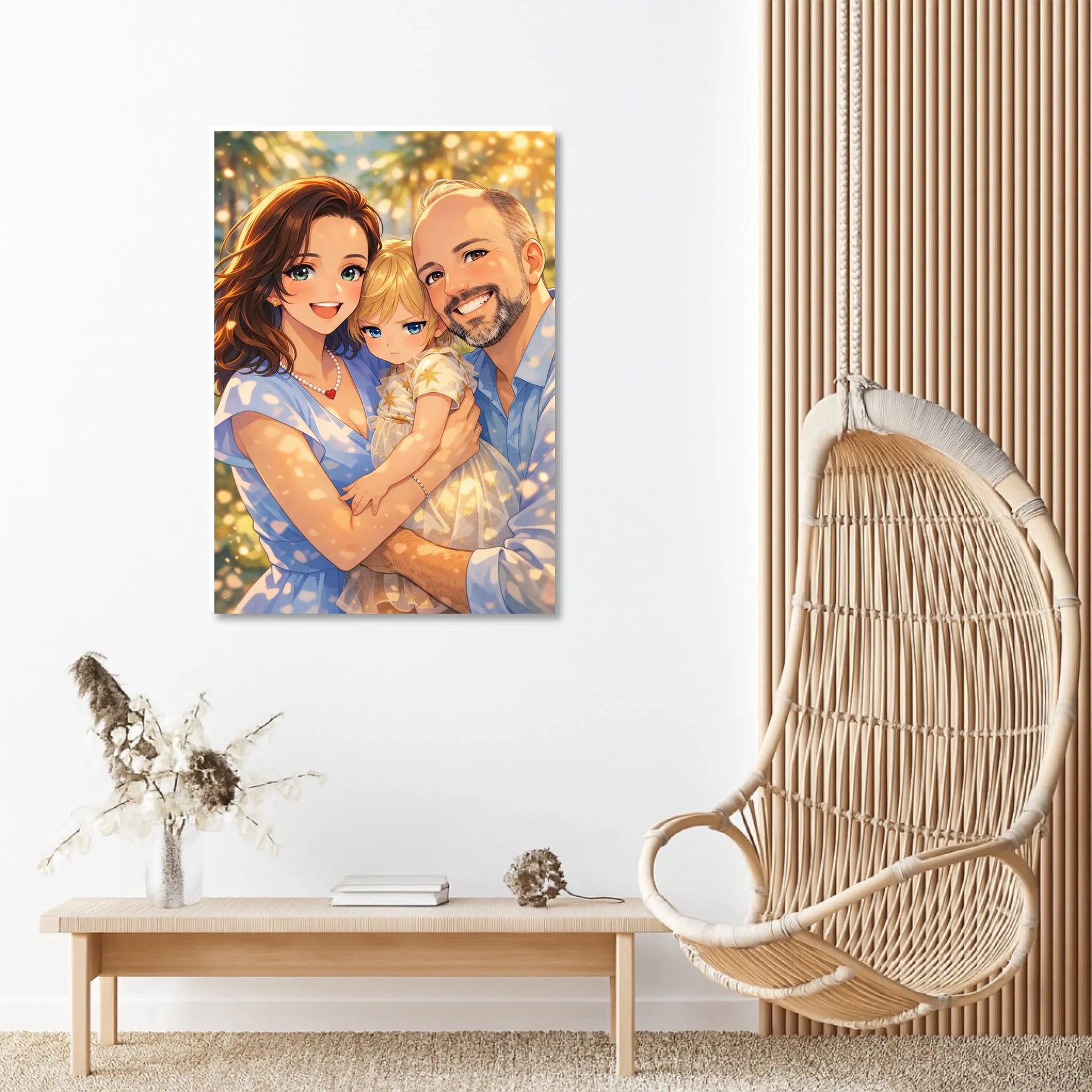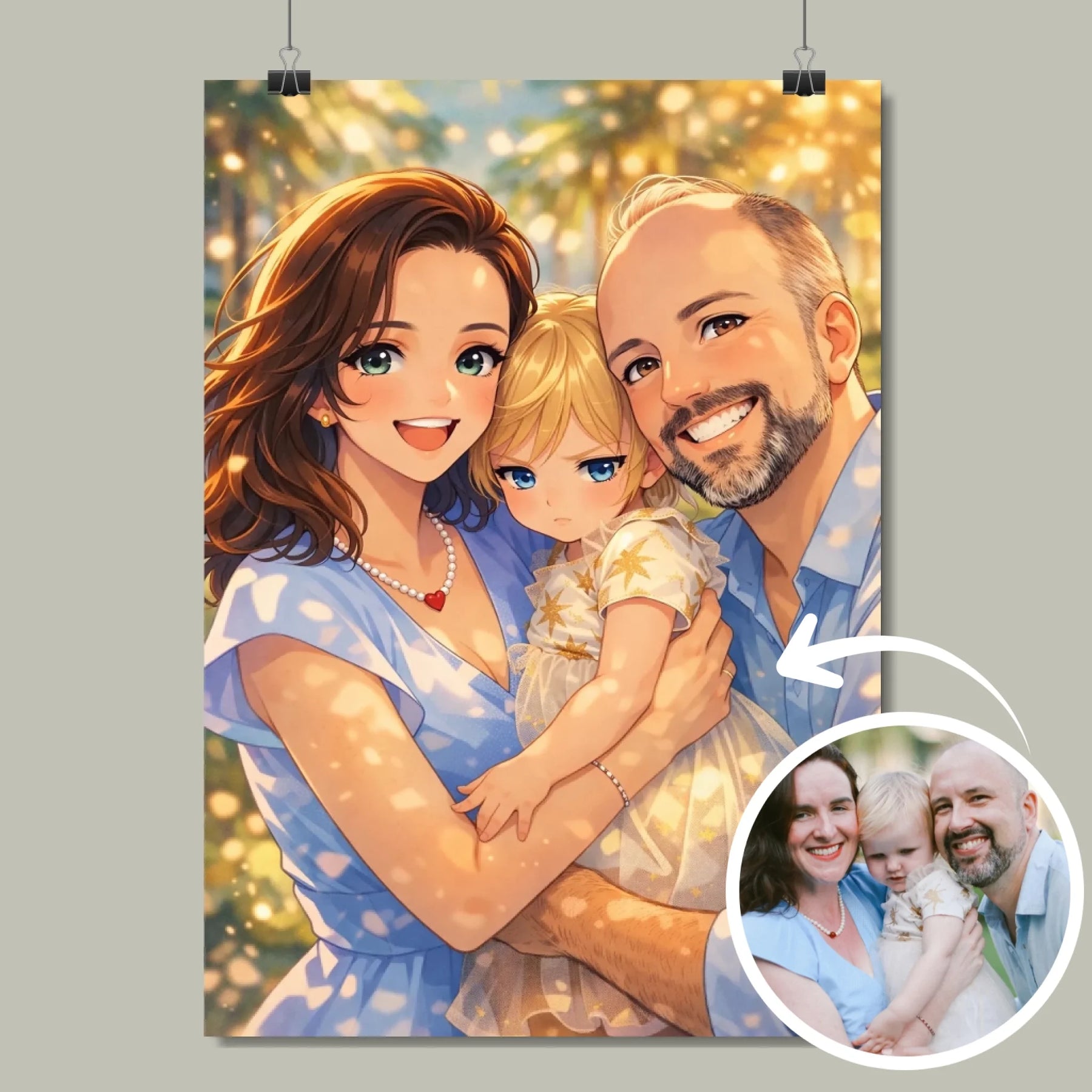 Anime stil z zlato svetlobo ustvari občutek nežnosti, varnosti in doma. Portret ne deluje kot risanka, temveč kot čustvena interpretacija družinskega trenutka, ki ga želiš imeti vedno pred očmi.