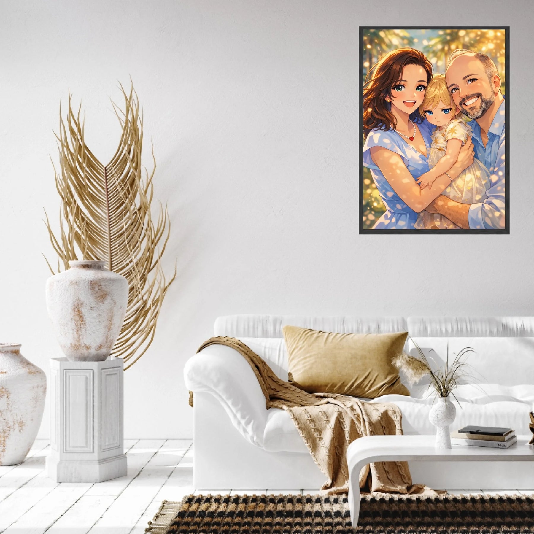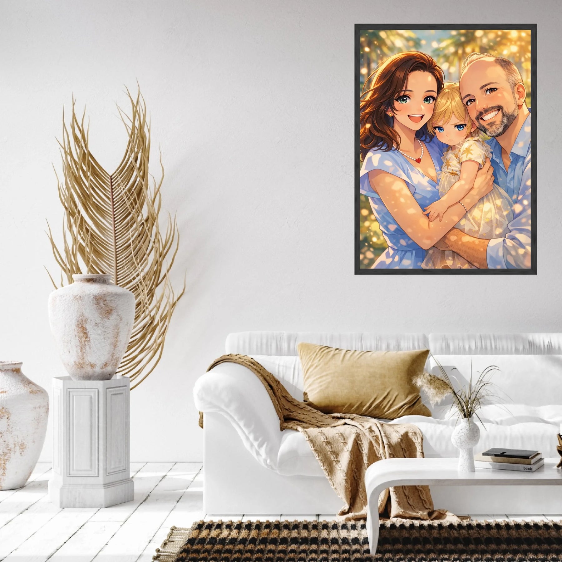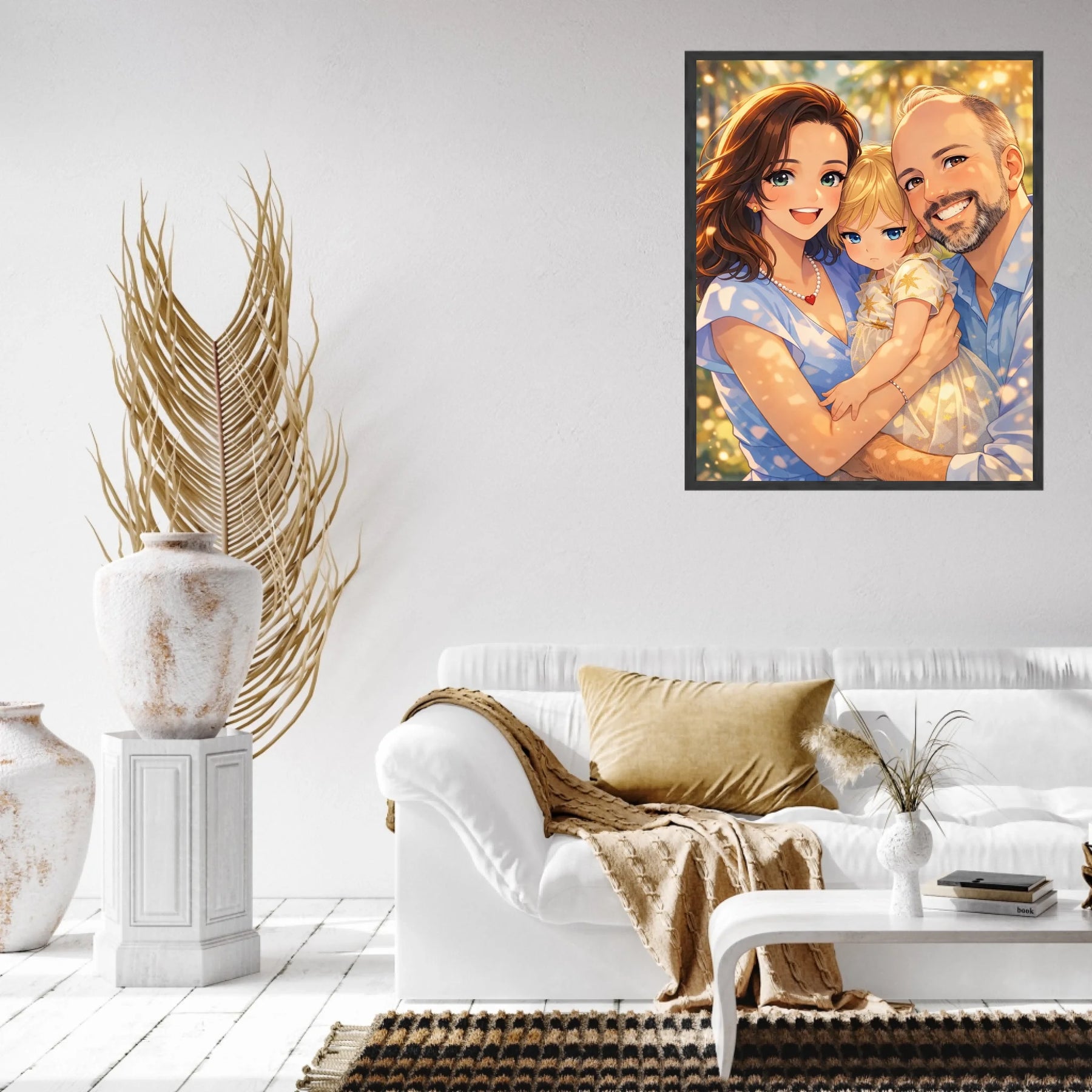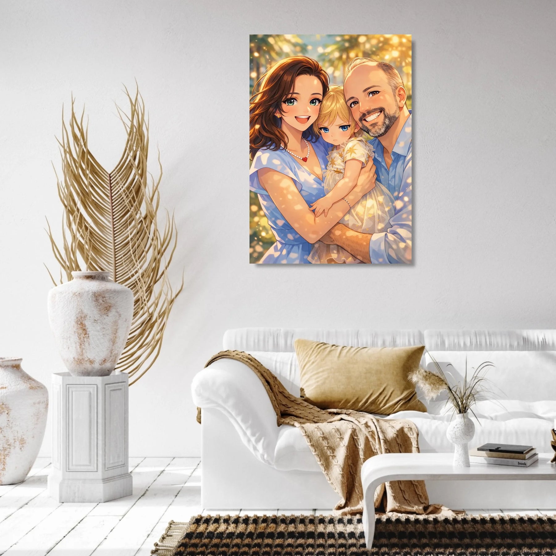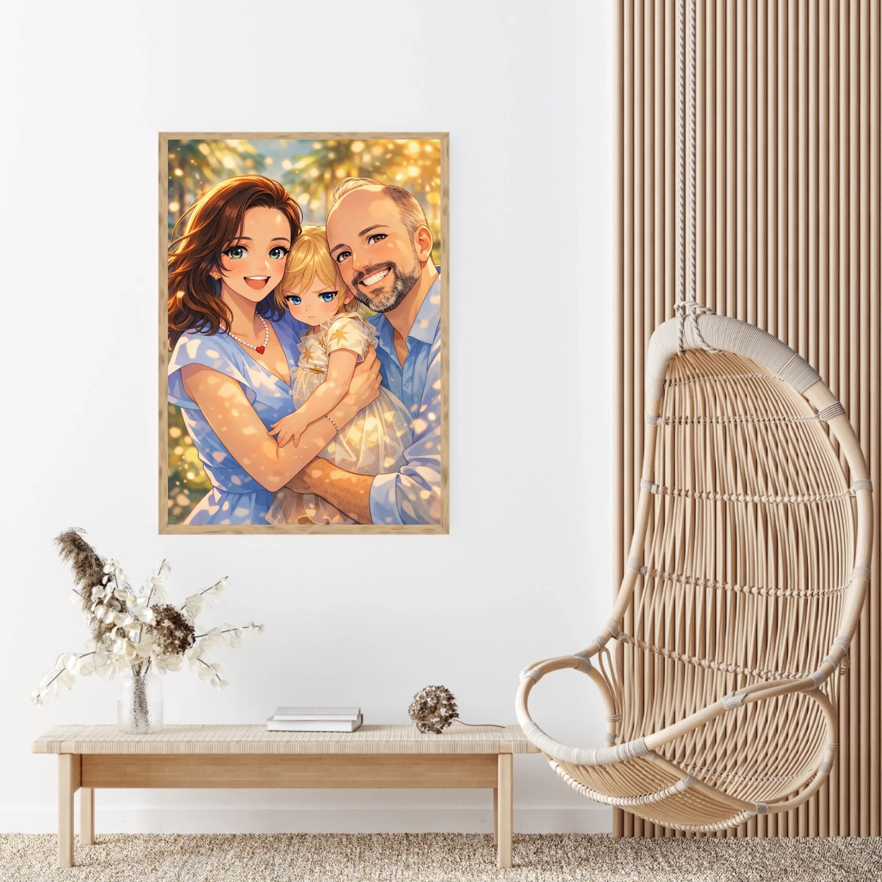 Anime stil z zlato svetlobo ustvari občutek nežnosti, varnosti in doma. Portret ne deluje kot risanka, temveč kot čustvena interpretacija družinskega trenutka, ki ga želiš imeti vedno pred očmi.