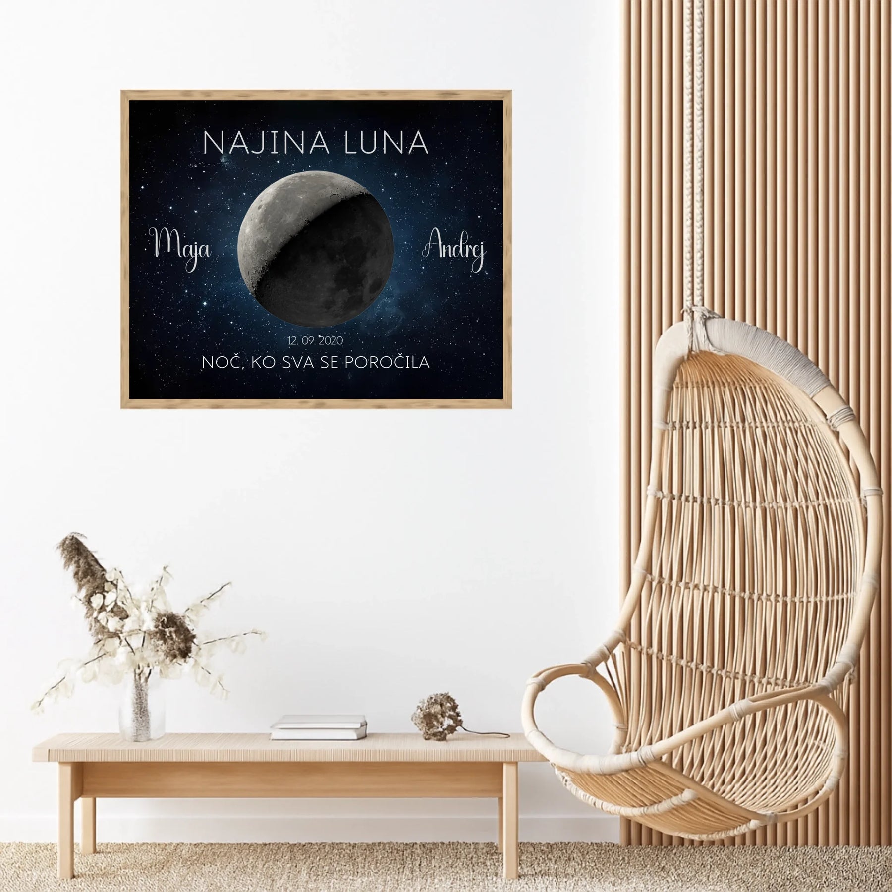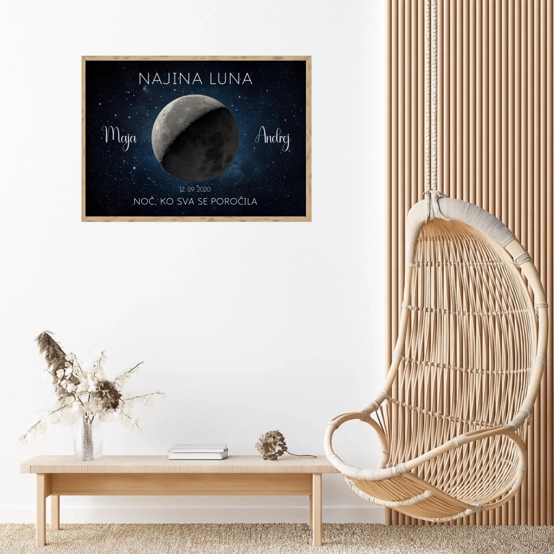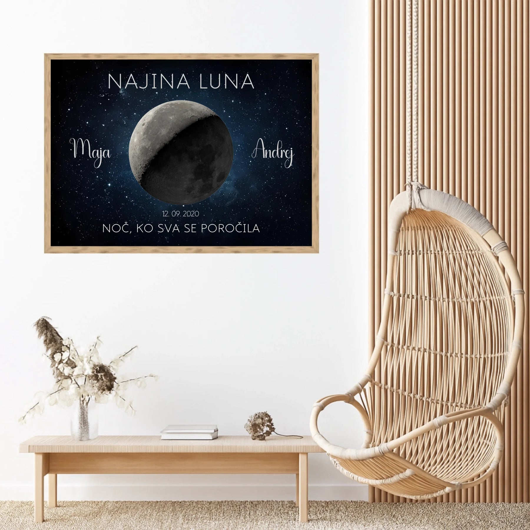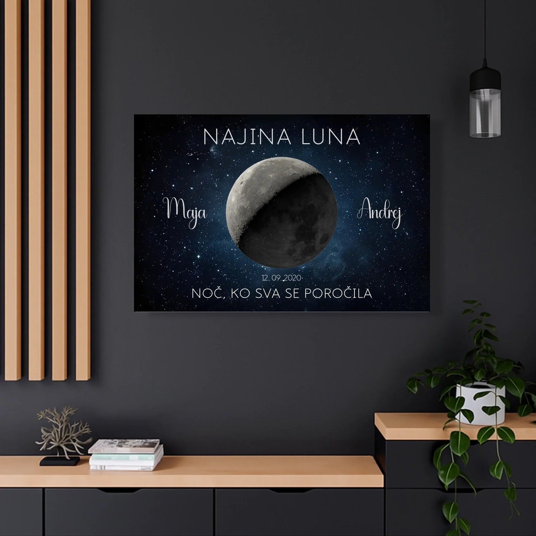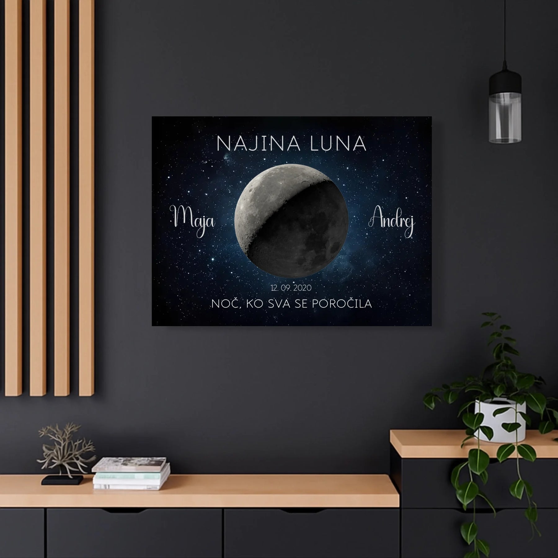 Ta personaliziran lunin plakat prikazuje točno takšno luno, kot je sijala na noč vajine poroke ali obletnice. Z imeni, datumom in krajem ustvari brezčasen spomin, ki bo vedno znova obudil isti občutek.