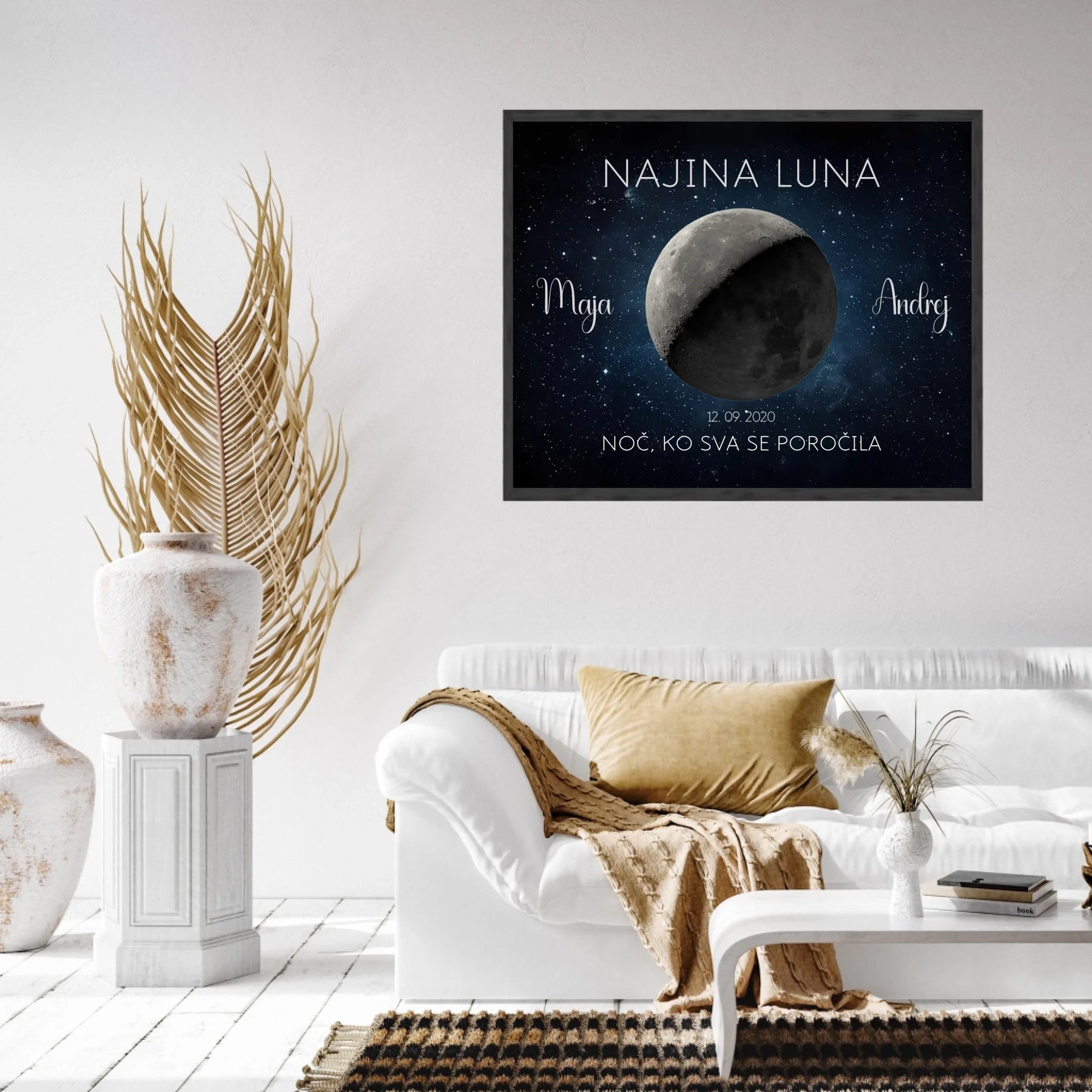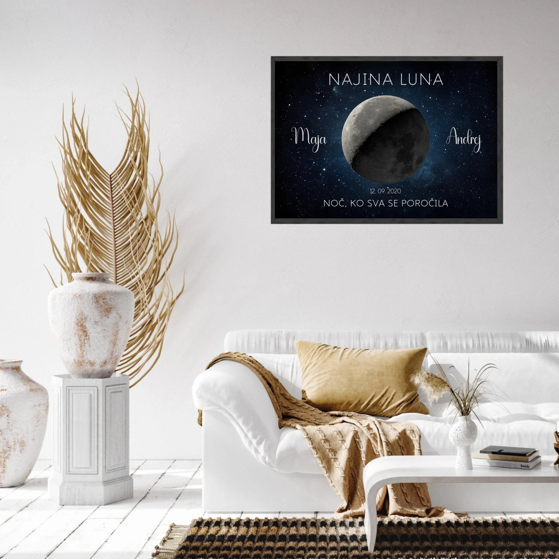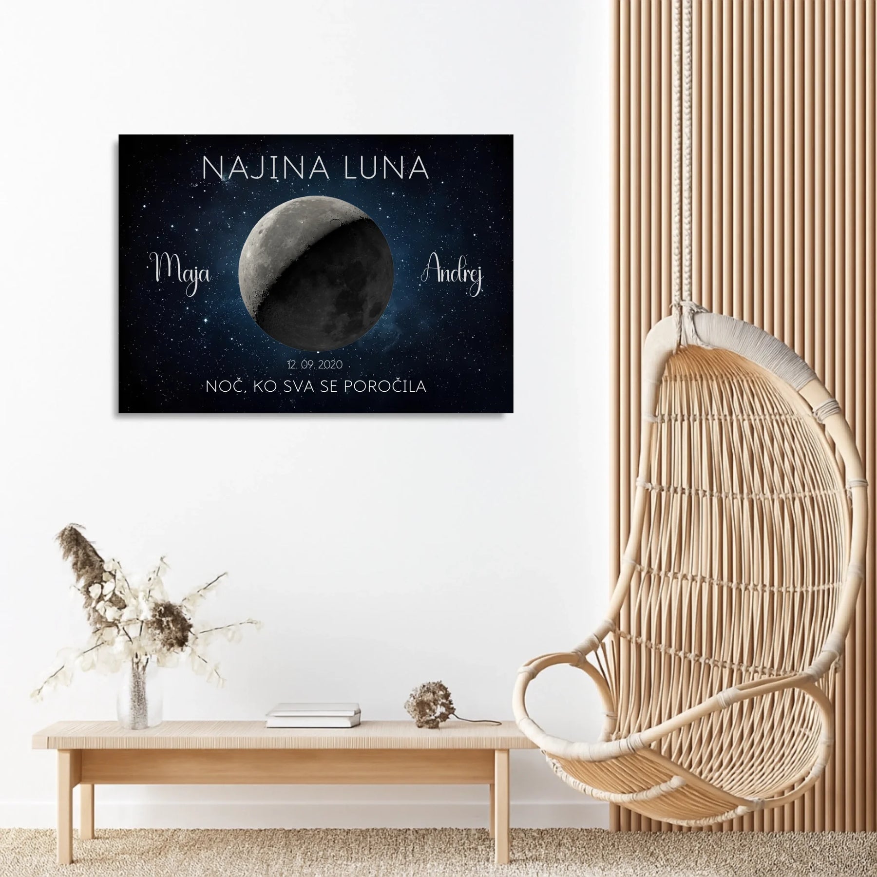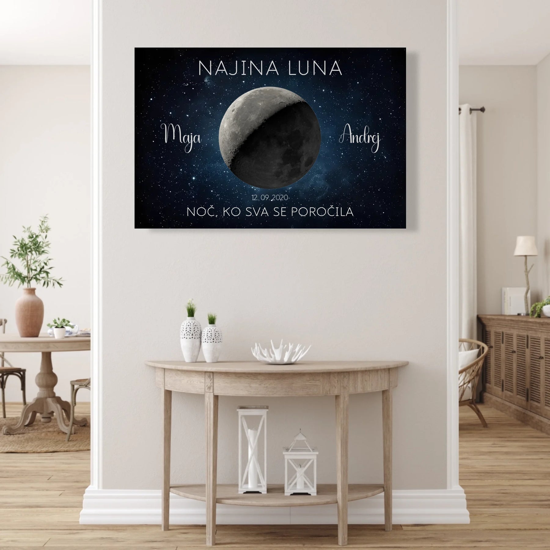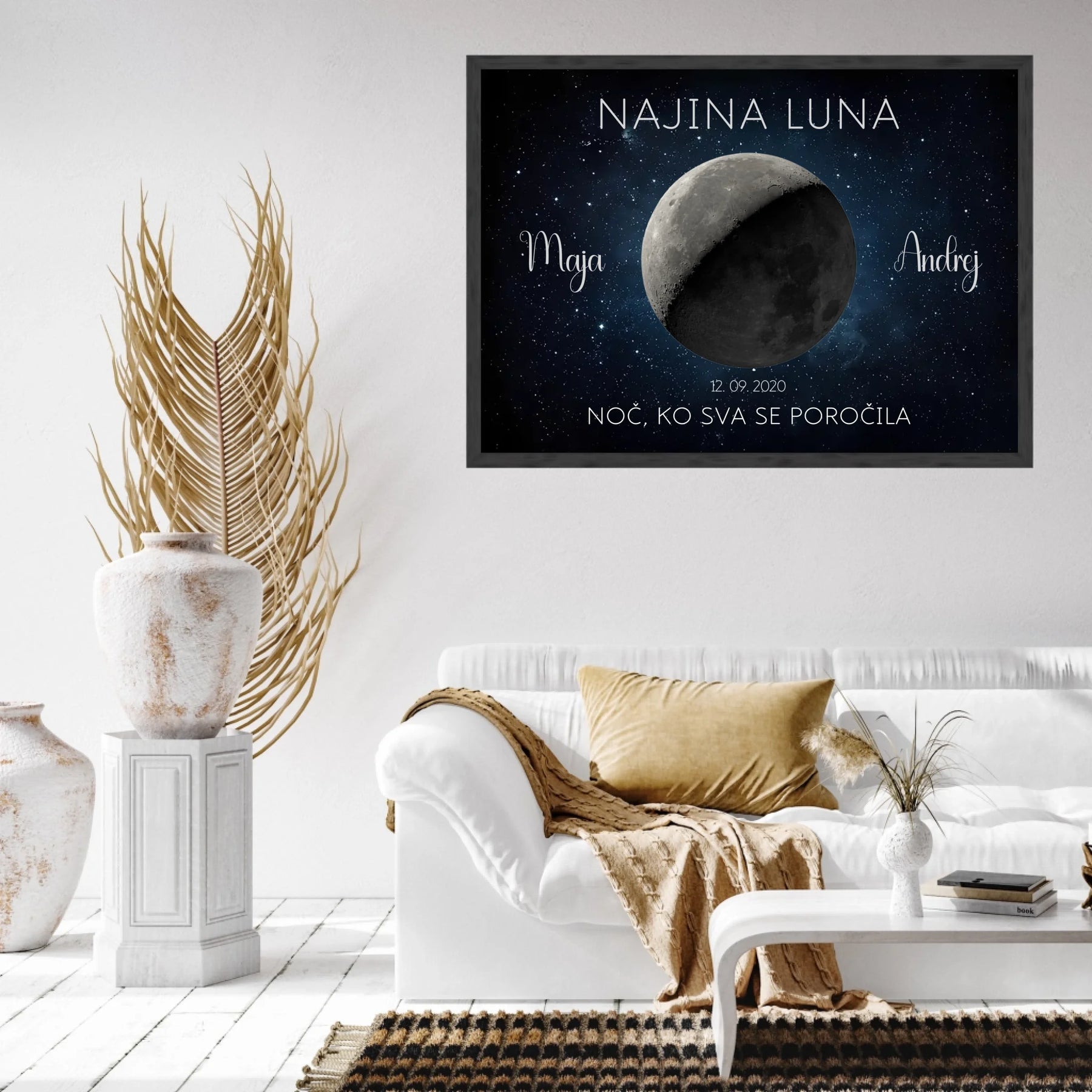 Ta personaliziran lunin plakat prikazuje točno takšno luno, kot je sijala na noč vajine poroke ali obletnice. Z imeni, datumom in krajem ustvari brezčasen spomin, ki bo vedno znova obudil isti občutek.